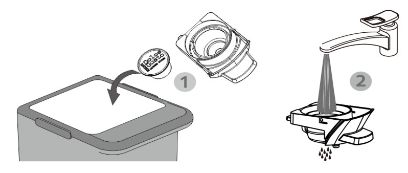 - ยกที่จับ ,ดึงตะกร้าชงออก และเติมแคปซูลที่ใช้แล้วลงในภาชนะ