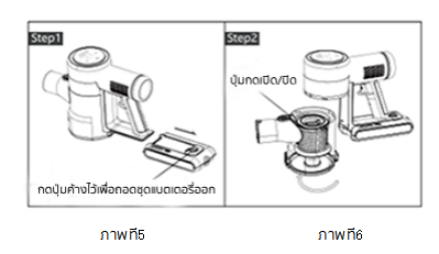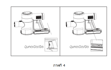 - กดปุ่มเปิดเครื่องเพื่อเปิดเครื่องดูดฝุ่น แล้วกดอีกครั้งเพื่อปิดเครื่องดูดฝุ่น (ตามภาพที่ 4)