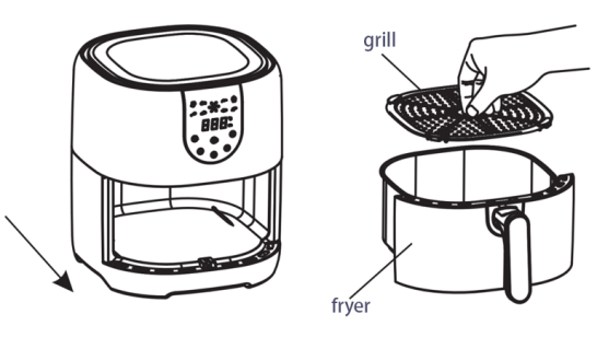 - Before use, put the baking tray into the frying basket, and then push the frying basket into the machine.