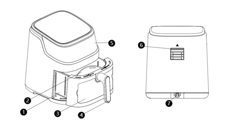 - Selama penggorengan dengan udara panas, lubang udara akan mengeluarkan uap panas. Jaga jarak aman antara tangan dan wajah dari uap panas dan saat menarik keranjang penggorengankeluar dari produk.
