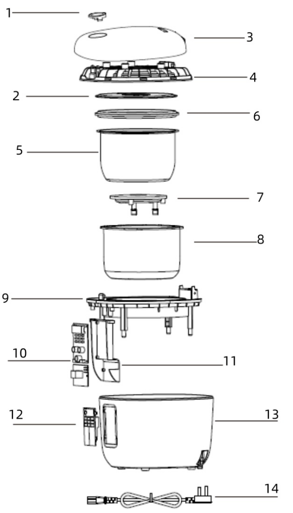 - Memasak perlahan, memasak cepat, memasak bubur, merebus sup, merebus sayur (fungsi yogurt, kue, dan memasak kukus tidak memiliki fungsi penghangat otomatis setelah selesai bekerja), penghangat, Timer, pilih/batal, mengaktifkan fungsi.