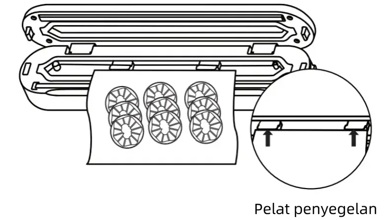 Menyegel kantong vakum dengan suhu tinggi. (Jangan langsung disentuh setelah penggunaan untuk menghindari luka bakar akibat suhu tinggi)