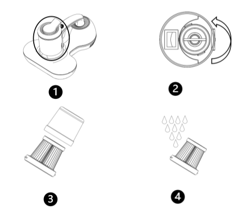 Hold the dust cup handle and take it out from the machine (Figure 1), then rotate the HEPA filter assembly anticlockwise to take out (Figure 2), take out the filter from the HEPA filter assembly, brush the dust out of the gap of the HEPA filter with brush, or gently tap the HEPA filter to clean the dust out, if necessary, clean HEPA filter with clear water (Figure 4), then dry it naturally before using;