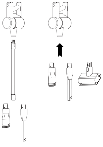 Push the long crevice tool or other accessories to the suction tube or the vacuum until it clicks into place.