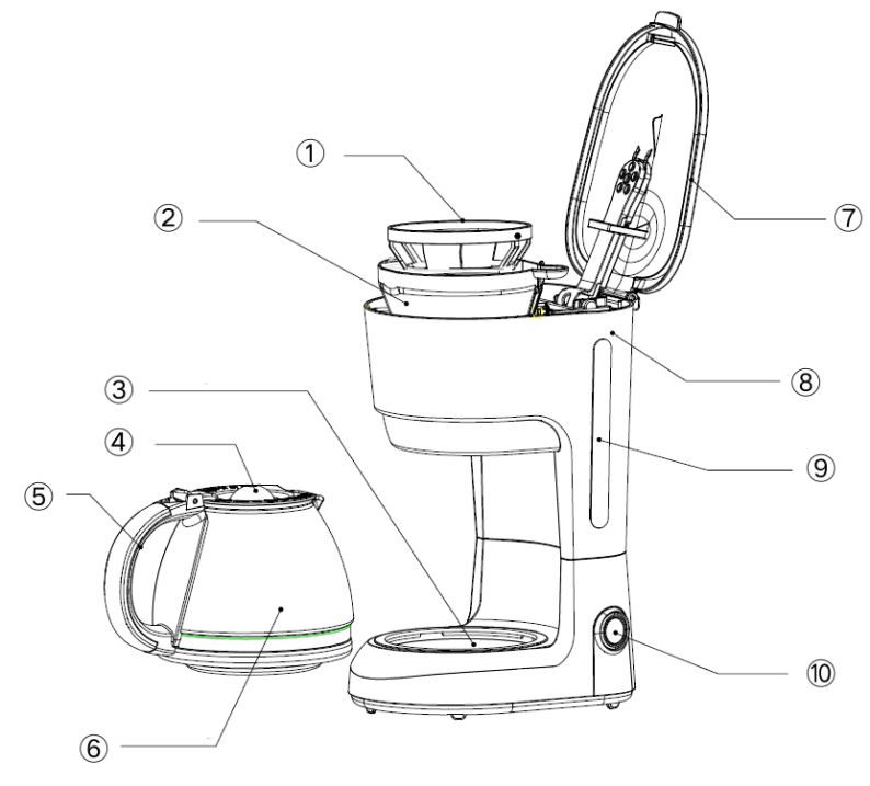 - Do not place the coffee maker on hot surface or beside fire to avoid to be damaged.