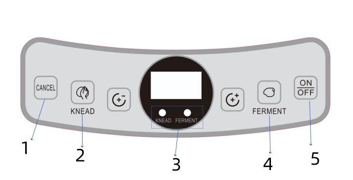 - Touch the fermenting function key. The default resting time is 90 minutes. The selected function will flash red, and you can adjust the time by touching the "+" or "-" buttons. The time can be set between 5 and 120 minutes. After setting the time, touch the Start/Stop function key. The light will turn blue, and the fermenting process will begin. If you need to knead the dough, adjust the kneading function before starting/stopping. The blue light turning off indicates the function is complete.