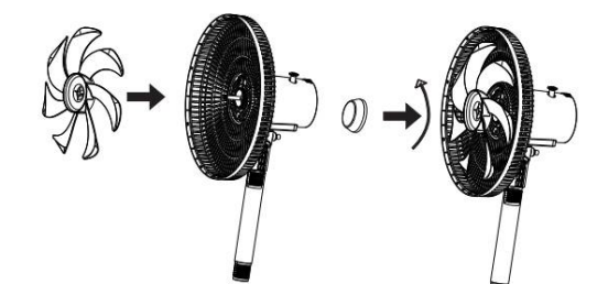 Remove the fan blade locking nut and rear net locking nut on the head assembly, then align the fan rear net with the head assembly and install it to the motor head. Tighten the rear net locking nut clockwise to fasten it.