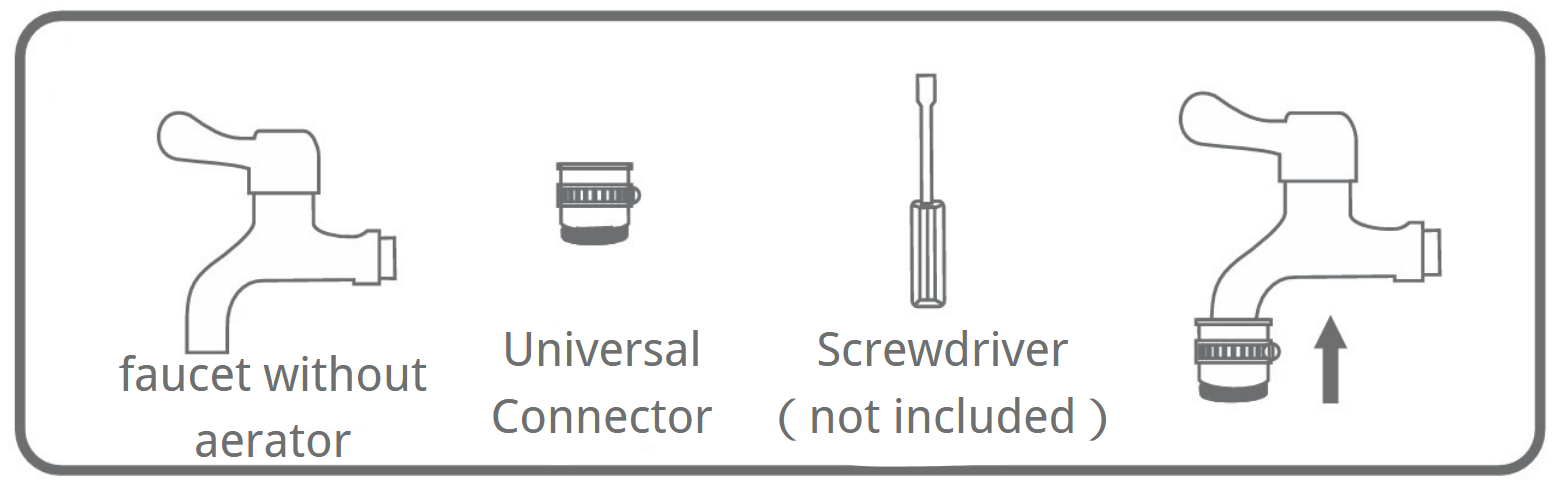 ① Install the universal connector onto the faucet, and tighten the clamping screw to avoid water leakage. During installation, remove the sealing rubber sleeve to adjust the inner diameter of the universal connector based on the faucet's diameter;