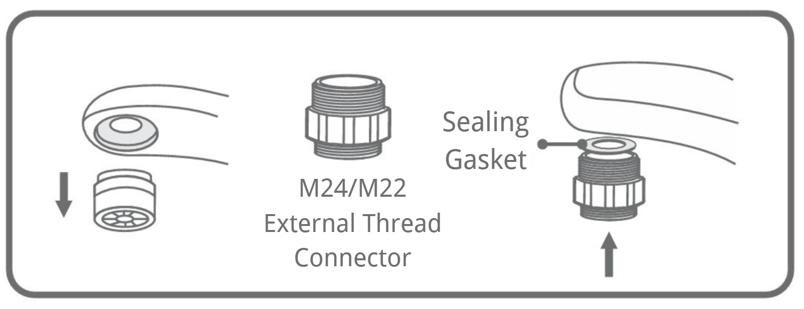 ① Unscrew the faucet aerators, put the corresponding sealing gasket on M22/M24 external thread connector, install the external thread connector (with the gasket) onto the faucet and tighten the nuts;