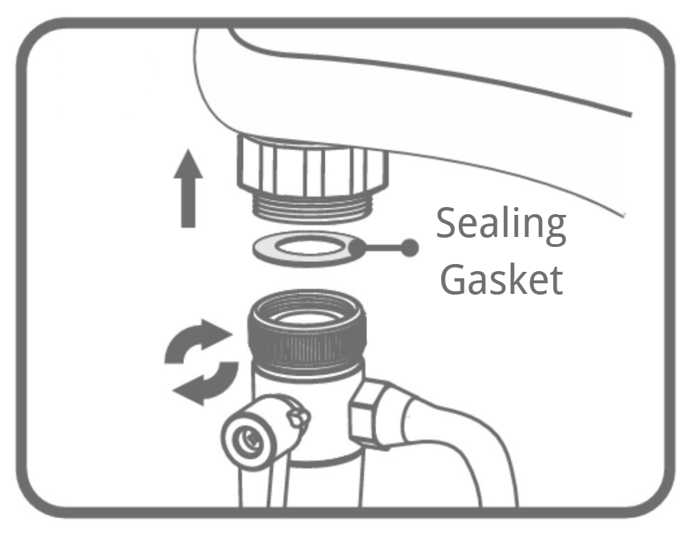 ② Connect the faucet connector (ensure the included gasket is properly positioned) to the external thread connector and tighten the nuts.