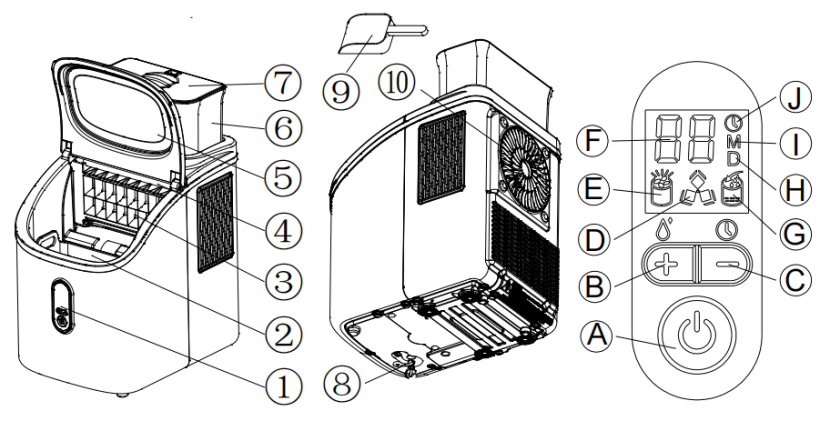 A: Nút Bật/Tắt: Khởi động hoặc dừng làm đá; đồng thời có thể hủy bỏ chương trình làm sạch và hẹn giờ; khi máy đang làm đá, nhấn và giữ nút này trong hơn 5 giây để máy sẽ chuyển sang chế độ rã đông.