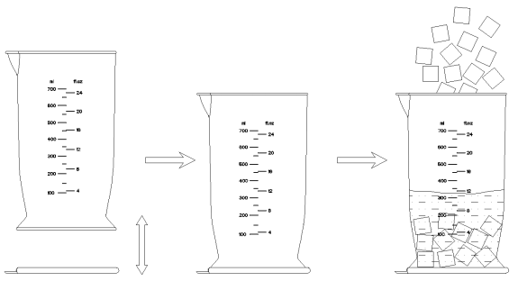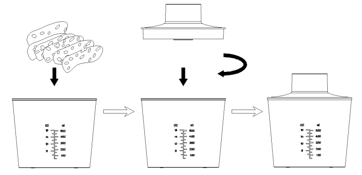 - Cắt nguyên liệuthành các khối nhỏ không vượt quá 15 mm, sau đó cho vào cốc đo lường và thêm một ít nước sôi để nguội, nước uống hoặc sữa, v.v. (Lưu ý: Đặt một miếng đệm dưới cốc đo lường và cho thực phẩm cùng nước vào trong cốc.)