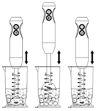 - Nhấn nút tốc độ cao hoặc thấp, máysẽ tiếp tục hoạt động. Để khuấy nguyên liệu hiệu quả và nhanh chóng hơn, hãy dùng một tay cầm cốc đo lường, tay còn lại cầm máy chính, thực hiện chuyển động lên xuống. Để dừng hoạt động, chỉ cần nhấn nút bật/tắt