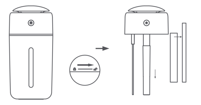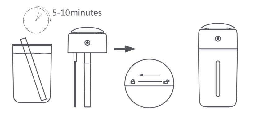 - Soak both ends of the cotton filter into water for 5-10 minutes, then put it in the slot. Grab the product by its head and rotate it to the direction of the locking button till the top cover falls into the water tank slot, then tighten it.