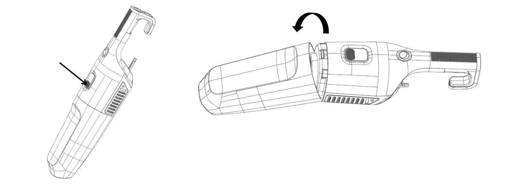 1. Tekan tombol pelepas cangkir debu, lalu putar cangkir debu sesuai arah panah untuk mengeluarkannya.