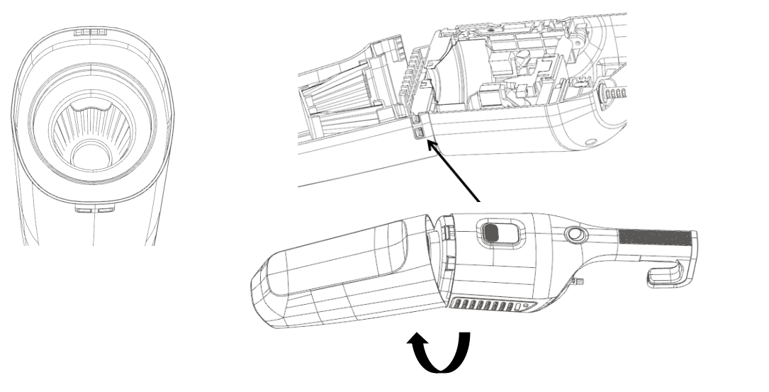 - Pegang unit utama, sejajarkan lekukan bagian atas cangkir debu dengan tonjolan pada unit utama, lalu masukkan tonjolan ke dalam lekukan dan putar komponen cangkir debu sesuai arah panah.