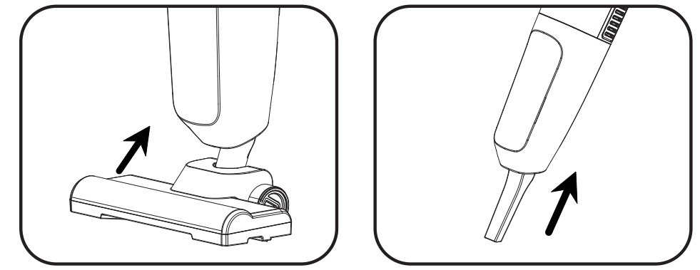 Sejajarkan saluran keluar udara unit utama dengan sikat lantai/penyedot tipis, Tekan ke atas dengan lembut untuk mengamankan.
