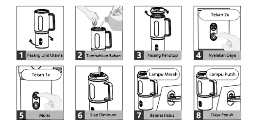 Sebelum menggunakan produk untuk pertama kali, isi daya sampai penuh dan bersihkan semua bagian yang kontak langsung dengan makanan. Produk ini dilengkapi proteksi keamanan, sehingga menyala hanya jika wadah sudah terkunci ke posisi yang benar.