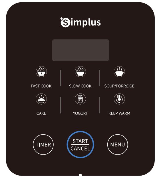 - Mulai/ Batal: Dalam mode memasak, tekan tombol "Batal" untuk membatalkan fungsi saat ini dan masuk ke mode siaga. Setelah memilih fungsinya, tekan tombol ini , penanak nasi akan mulai bekerja, dan lampu indikator start akan menyala.