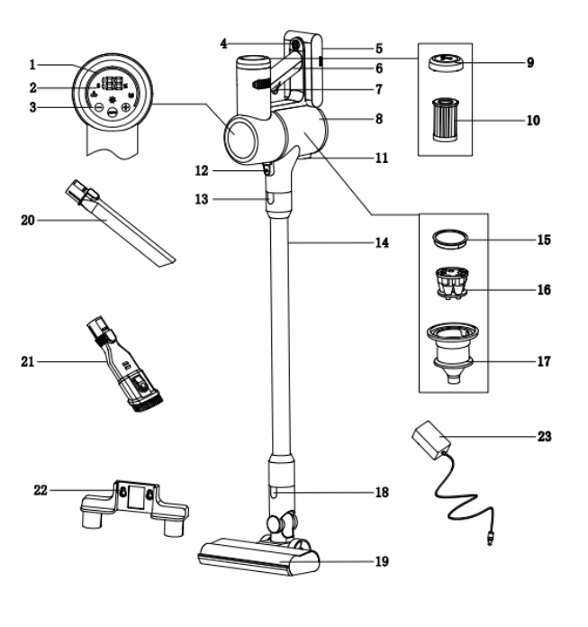 - Catatan: Saat sakelar daya ditekan, penyedot debu bekerja dan kemudian berhenti, dan tampilan layar menyala dan kemudian mati, menunjukkan bahwa daya tidak mencukupi, dan baterai perlu dihubungkan ke adaptor untuk pengisian daya.