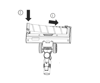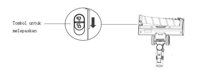 - Pastikan penyedot debu dimatikan. Tekan tombol pelepas sikat lantai bawah untuk melepaskan sikat lantai, lalu balikkan sikat lantai untuk membuka sikat rol.