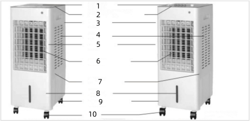 Press this key to activate the cooling and humidifying function. The water pump in the water tank will start, drawing water from the tank to the upper water tank. The water in the upper tank will then flow onto the wet curtain. If frozen ice crystal boxes are added to the upper water tank, the temperature of the air output can be reduced by approximately 2-3 degrees Celsius within a few minutes, achieving optimal cooling effect. Press this key again to deactivate the cooling function.