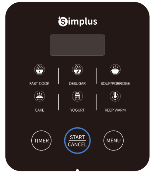 - Mulai/ Batal: Dalam mode memasak, tekan tombol "Batal" untuk membatalkan fungsi saat ini dan masuk ke mode siaga. Setelah memilih fungsinya, tekan tombol ini , penanak nasi akan mulai bekerja, dan lampu indikator start akan menyala.