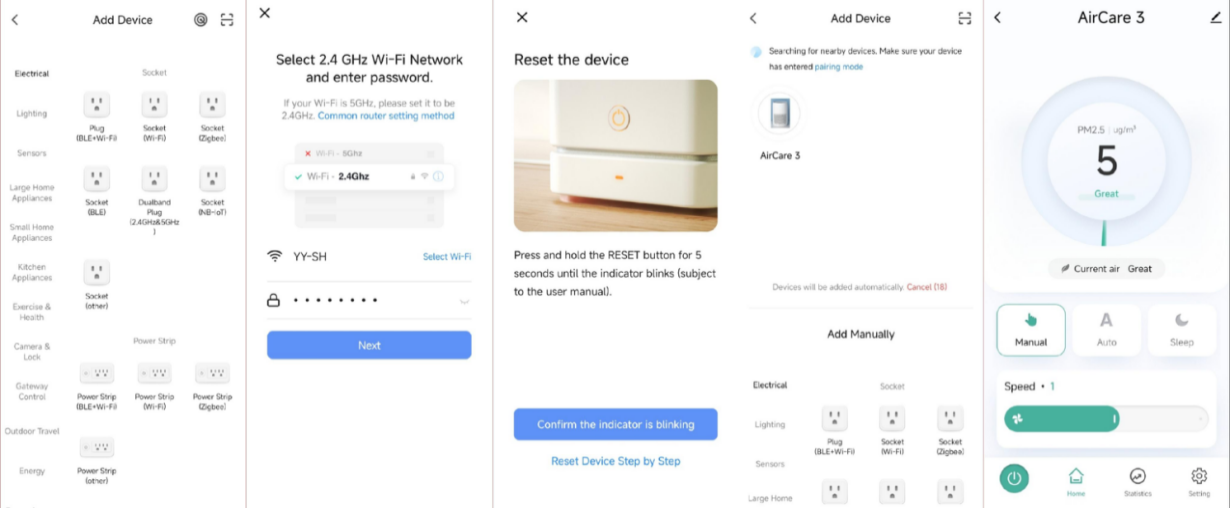 When the Wi-Fi indicator flashes, select 'Add Device' → 'Small Appliances' → 'Air Purifier' within the app, then follow the on-screen prompts. Check the Wi-Fi indicator status. If it flashes rapidly, the connection is complete.