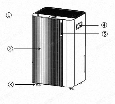 Press to turn the unit on/off. When the device starts,  the operation indicator light up, defaulting to high fan speed with a humidity setting of 50%. While the device is running, press the power button to shut it down. The operation indicator turns off, the compressor stops immediately, and the fan continues for 30s before stopping.