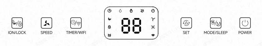 Short press activates negative ion purification. Long press for 3s activates lock mode, with the indicator light illuminating. All buttons except this one become inoperable. Long press again for 3s to deactivate lock mode, and the indicator light will turn off.