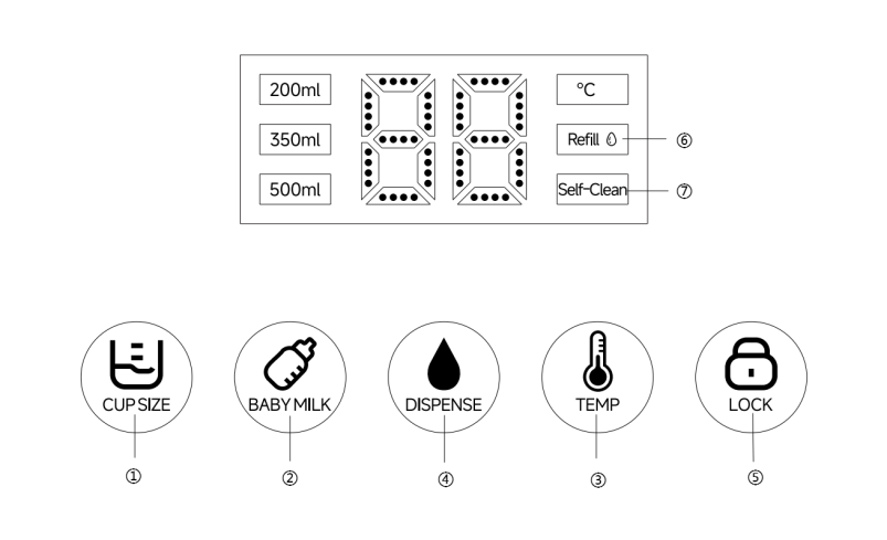 *The dispenser automatically locks after 30s of no operation. Only the Child Lock button remains illuminated while all other buttons and the dispenser outlet ambient light turn off.