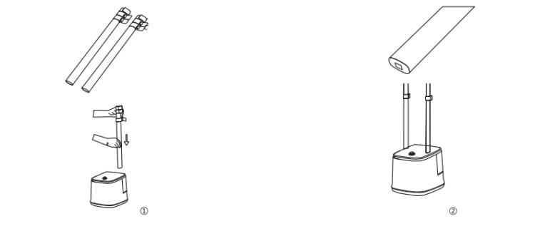 1. Insert the flat side of the lift rod into the front of the main unit. Open the clips on the first and second sections, extend them, and secure them tightly.