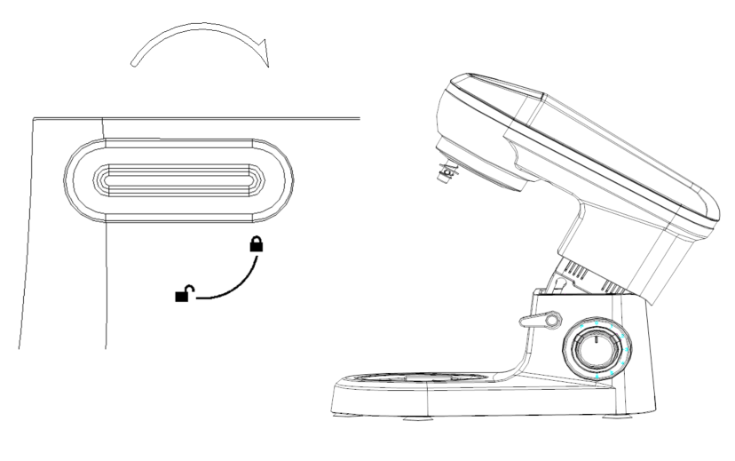 2. Turn the swivel arm release button (2) clockwise. at the same time lift the swivel arm with your hand so that it locks into place with a click, The swivel arm(1) tilts up.