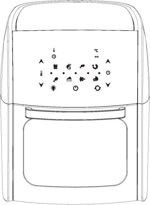 Once the Unit is plugged in, the power button will light up. selecting the power button once (press 2 seconds) will cause the full panel to be illuminated, selecting the power button a second time will activate the cooking process at the default temperature of 365°F (185°C) and time of 15 mins, selecting the power button at anytime during the cooking process will pause the unit, press 2 seconds the power button will shut down the unit, when you see digital screen shows "OFF", the motor will stop working after 15 seconds and hear the "beep" warning tone 3 times.