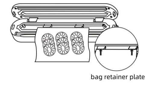 - Insert the open end of the vacuum bag into the machine’s vacuum chamber. For optimal results, position the bag opening under the bag retainer plate.