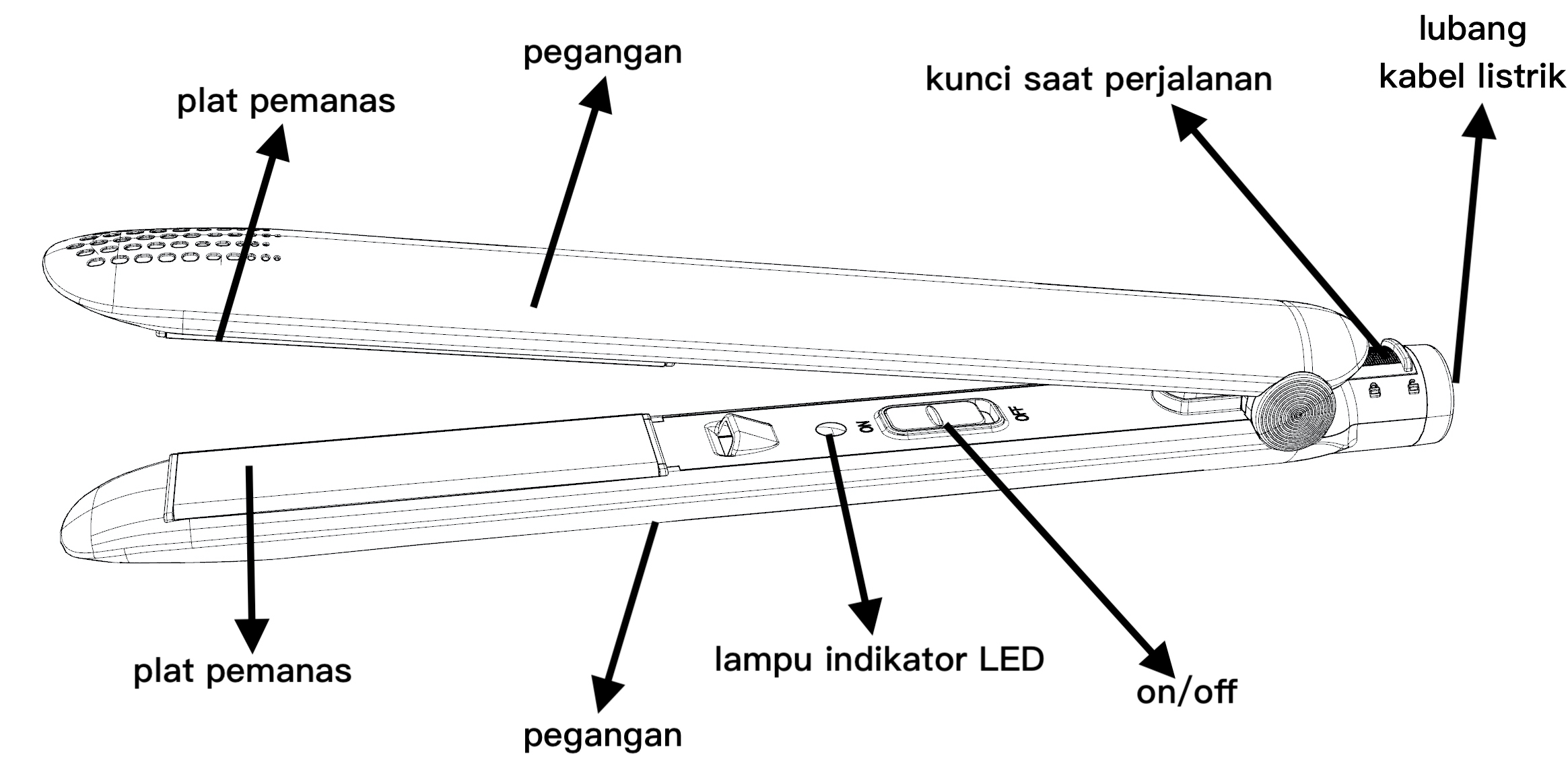 - Terkunci: Tutup pegangan atas dan bawah catokan/pelurus rambut dengan erat menggunakan tangan, dan dorong blok pengunci ke depan (searah plat aluminium) untuk menguncinya;