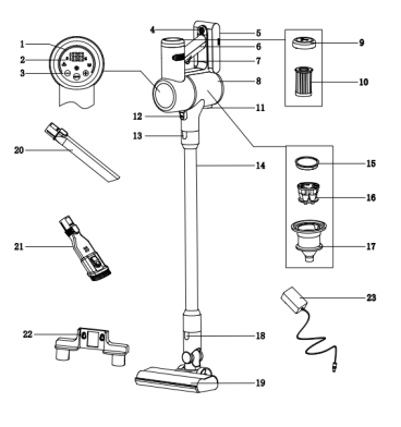 • คำเตือน: ก่อนดำเนินการบำรุงรักษาใดๆ ตรวจสอบให้แน่ใจว่าได้ปิดเครื่องดูดฝุ่นแล้วและไม่ได้ชาร์จเครื่องทั้งหมด , มิฉะนั้นอาจส่งผลให้เกิดไฟฟ้าช็อตหรือการบาดเจ็บส่วนบุคคลอื่นๆ