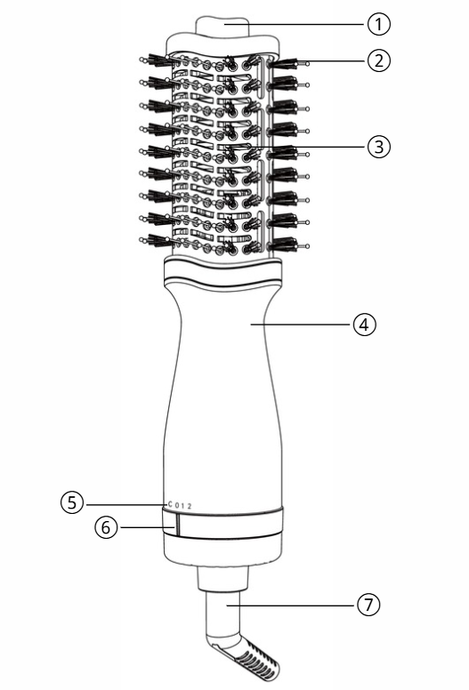 2. The brush is equipped with three settings: low heat and high speed (C), medium heat and low speed (1), and high heat and high speed (2), which can be selected as needed. As a general guide, use high heat and high speed (2) for rough drying for thicker hair, medium heat and low speed (1) for finer and more precise control when styling, and low heat and high speed (C) at the end to set the style. After use, switch the knob to the off position (0).