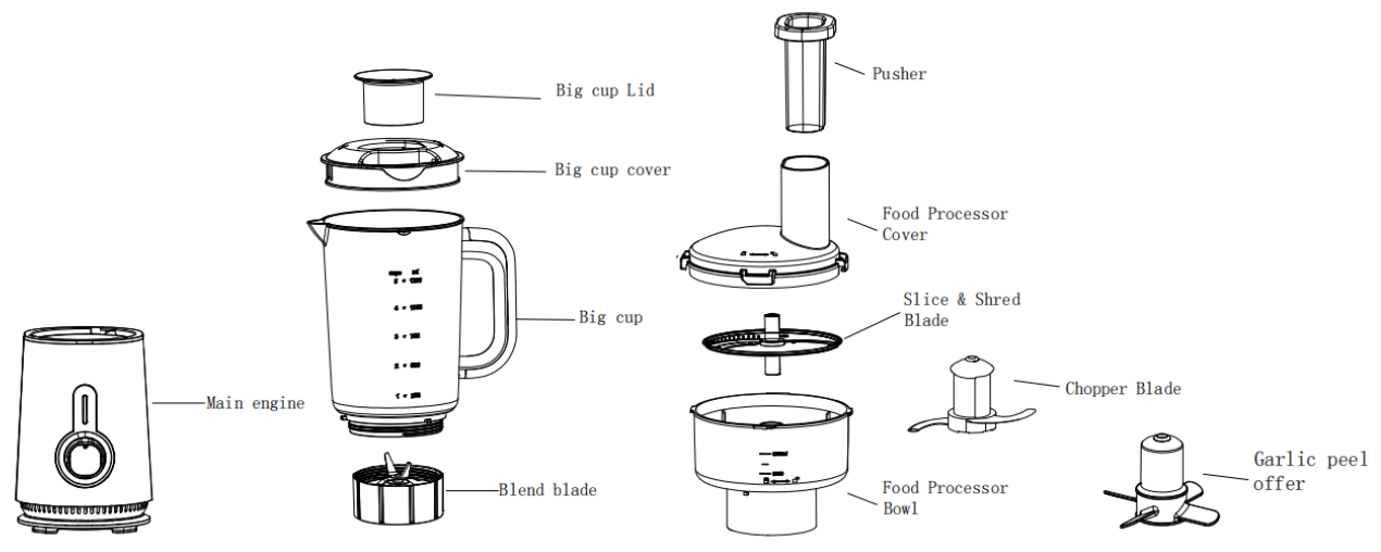 • A5: Blender jug for fruit, Chopper bowl for meat, Short cup for coffee bean.